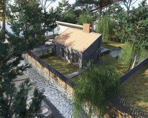 This modern and economical house is considered as one of it kind. The light-colored stucco exterior, accented by warm wood slats, evokes both the clean lines and geometric shapes of the International Style and the Mid-Century Modern movement with sustainable materials.